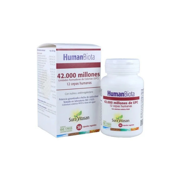 Human Biota contém mais de 42. 000 milhões de UFC, com 12 cepas de benefícios de origem humano junto com prebióticos complementares de origem natural inulina (achicoria) e A. O. S. (alerta).